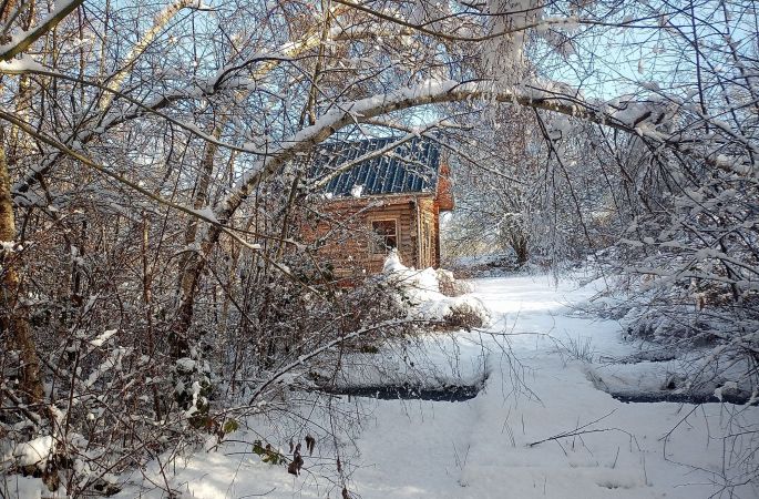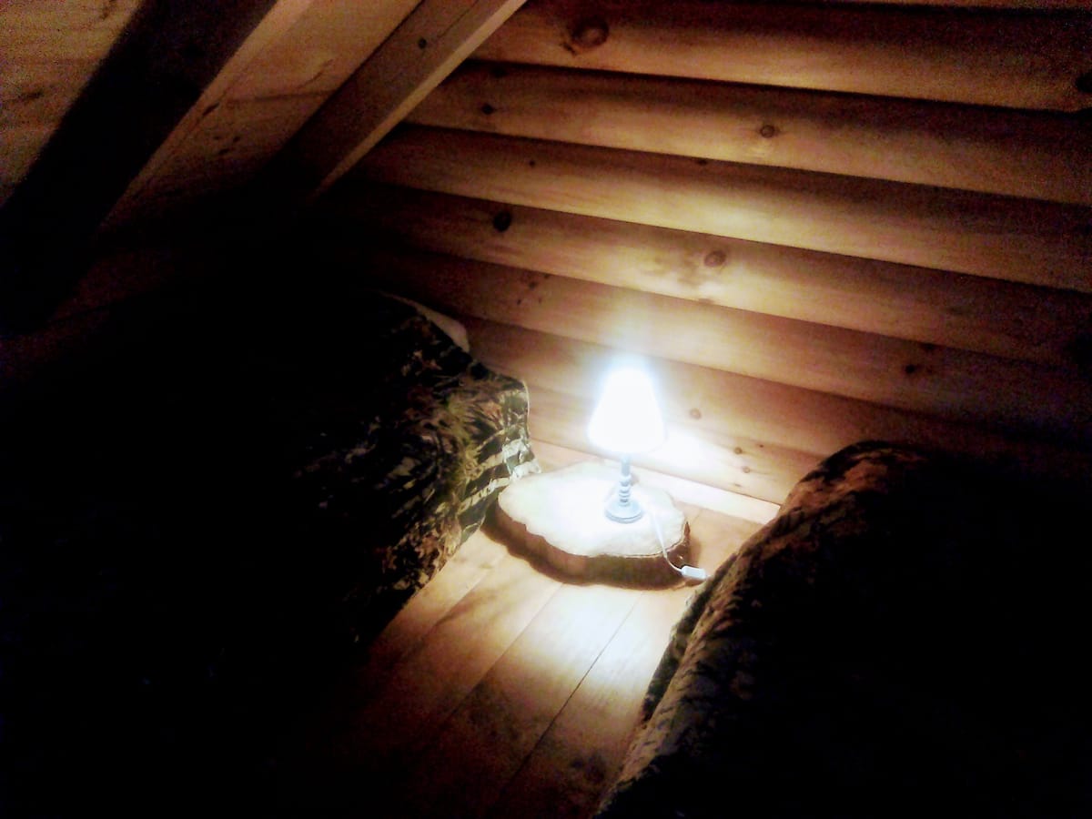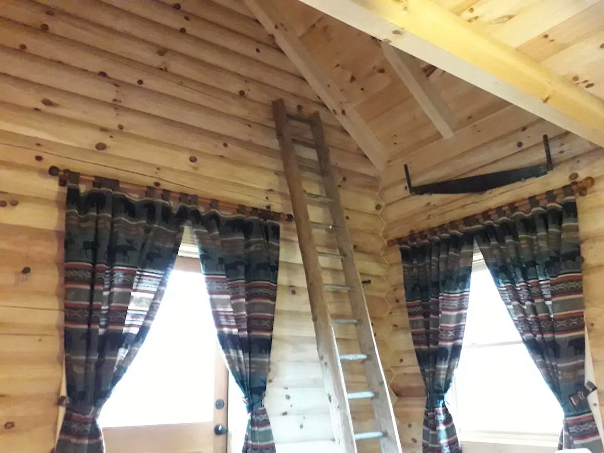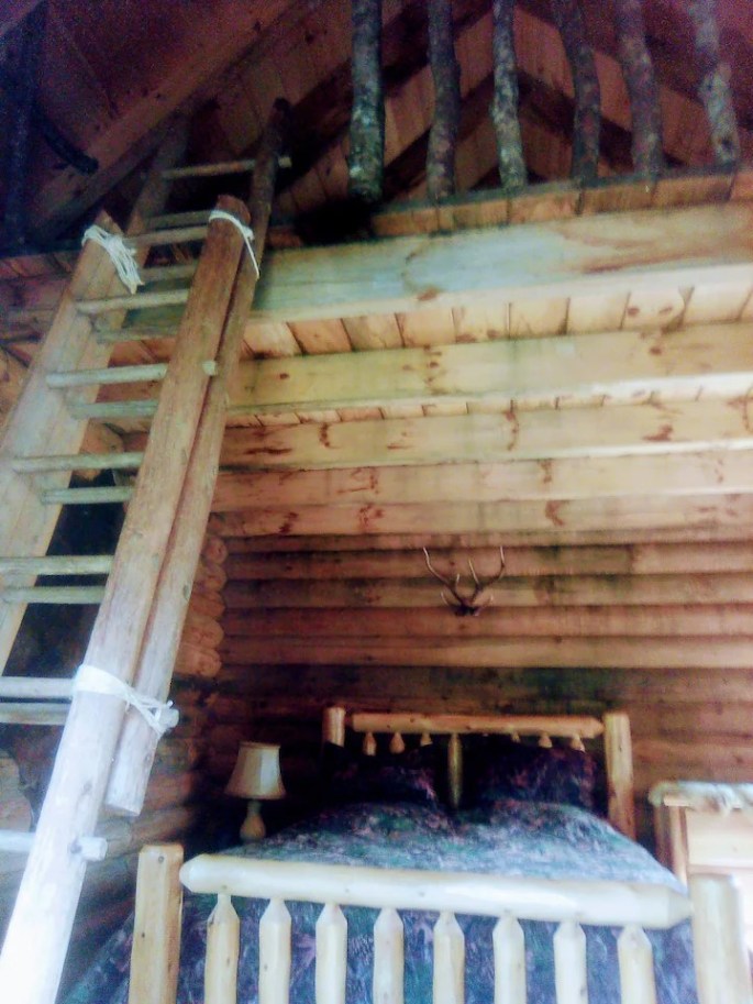 Le rez-de-chaussée comprend , entre autres, des meubles du Kentucky en rondins de cèdre : 1 lit double Queen size hyper confortable (largeur 160 cm), 1 table ronde et 4 chaises et 1 meuble de rangement à 3 grands tiroirs. La mezzanine est accessible par une échelle de meunier (rusticité oblige!) et comprend 2 lits simples tout confort. Durant votre séjour, le chalet entier vous sera réservé, mais ce n’est pas un gîte autonome, même si vous aurez une certaine indépendance. C’est un lodge, accessible et habitable en toutes saisons, même sous la neige!